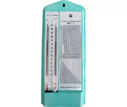 Конструкция психрометрасостоит из пластмассового основания, на котором закреплены температурная шкала с двумя капиллярами, резервуар одного из которых увлажняется фитилем из ткани, опущенным в стеклянный питатель с водой, и психрометрическая таблица для определения относительной влажности воздуха по разнице показаний "сухого" и "увлажненного" термометров.