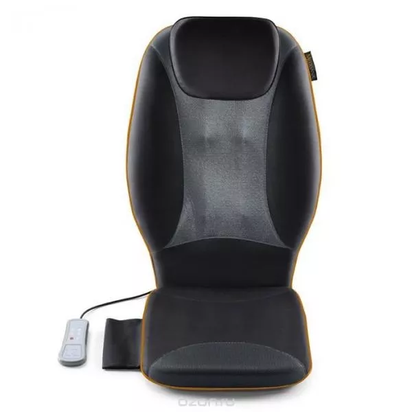 Роликовый массажер-накидка MEDISANA RBM предлагает две различные техники массажа: вибрационный массаж в сиденье и разминающий роликовый массаж в спинке. Благодаря двум встроенным моторам сиденье вибрирует с высокой частотой, за счет чего возникает вибрирующее движение, передаваемое на бедра. При этом можно выбрать одну из двух ступеней интенсивности массажа (Lo - низкая / Hi - высокая), а также нормальный, постоянный или пульсирующий вибромассаж (Normal - постоянный / Pulse - пульсирующий). Одновременно можно включить разминающий массаж посредством роликов с подогревом или без подогрева в спинке массажера. При этом выполняется бережный массаж мышц в области затылка, плеч, спины и талии четырьмя шариковыми роликами , расположенными с учетом анатомического строения человека. Равномерное передвижение роликов вверх и вниз приятно массирует мускулы. При включении функции подогрева массажное действие ускоряется и усиливается. При этом тепло выделяется в двух боковых поверхностях спинки. Уникальная комбинация интенсивного вибрационного и разминающего массажа и теплового воздействия в массажере позволяет добиться эффективного расслабляющего эффекта. Отдельные функции можно комбинировать в произвольном порядке. Настройки выполняются на удобном в обращении блоке управления . Вы можете проводить массаж, комфортно сидя в кресле. Положите массажер-накидку RBM на стул или в кресло с высокой спинкой. Используйте для этого практичные фиксирующие ремни на задней стороне массажера. Подголовник обеспечивает дополнительный комфорт, а блок управления удобно убирается в карман , если он не нужен.