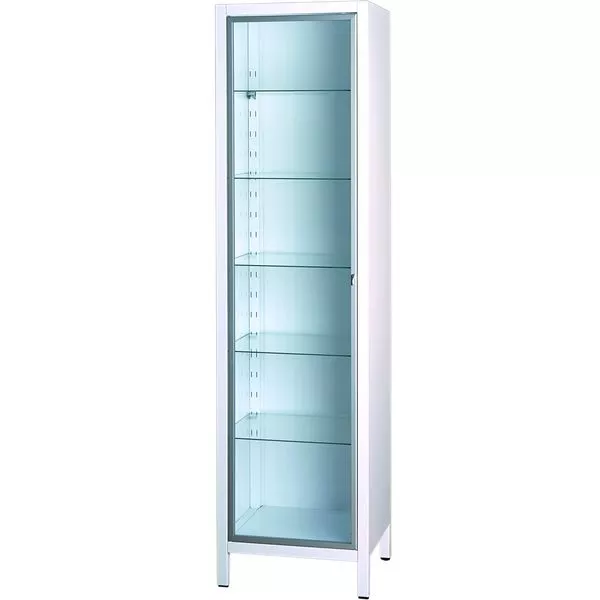 Одна секция с высокими дверцами из стекла в рамке из анодированного алюминиевого сплава и пятью регулируемыми стеклянными полками.