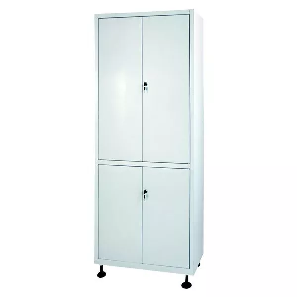 Верхняя секция с двумя, а нижняя с одной полками и запирающимися дверцами из стали.