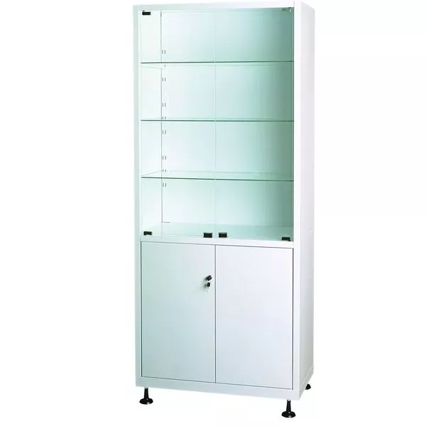 Верхняя секция с дверцами и тремя полками из стекла. Нижняя с запирающимися дверцами и полкой из стали.