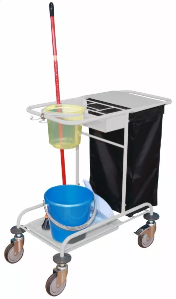 Тележка предназначена для внутрикорпусной транспортировки приспособлений и принадлежностей, необходимых для уборки помещений и сбора мусора в лечебных учреждениях.